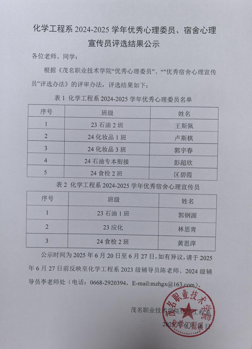 化工系2024-2025学年优秀心理委员、宿舍心理宣传员评选结果公示