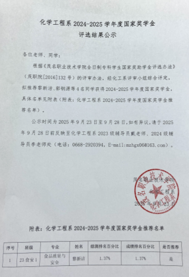 化学工程系2024-2025学年度国家奖学金评选结果公示