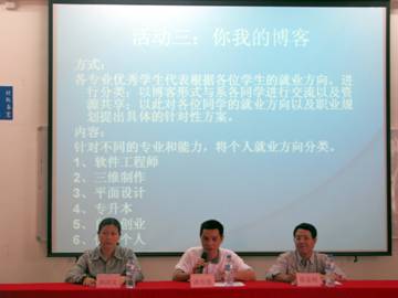 活动紧抓“让学生得实惠”为出发点,结合系的特色,具体包括三个方面工作:一、“我们的纪念册”:利用我们的纪念册记录我们大学生活中的点点滴滴。二、“心连心?手牵手”:老师和学生代表以宿舍为单位对学生的学习、工作、生活进行走访和跟踪,并进行实际指导。三、“你我的博客”:针对不同的专业和能力,将个人就业方向进行分类并建立博客,让同学们进行交流和实现资源共享,以此对各位同学的就业方向和职业生涯规划提出具体的针对性方案。