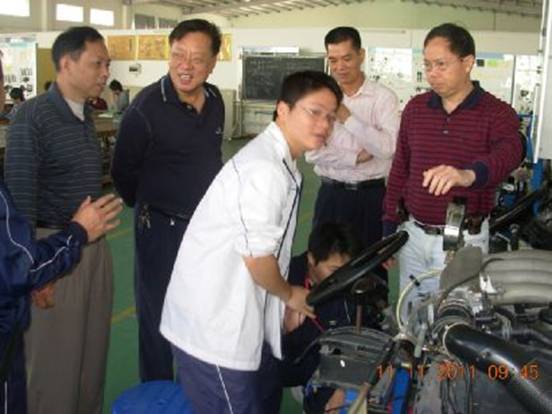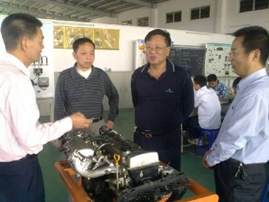 随后,陈院长来到汽车实训室,对正在开展行动项目教学法的师生们详细了解情况。他亲切地询问了学生对这种学习方式的感受和体会,向授课教师郇锐铁老师了解授课方法和内容。在听取了教师和学生的回答后,对汽车教研室大力推广这种教学方式取得的效果表示肯定和赞扬。当了解到邓川老师正指导着大三学生通过毕业设计的形式修复早已损坏的实训设备,既提高了学生的实操水平,又能节省设备维护费用,使旧设备焕发新光彩时,陈院长表示十分满意。此外,柯燕忠老师也热情向陈院长介绍了如何购买物美价廉的汽修实训设备的情况,对这种因钱制宜、因用制宜,想方设法为学院和学生着想的做法,陈院长鼓励教师们多多学习,勤俭办学,大力发扬花小钱办大事的精神作风。