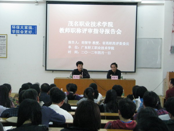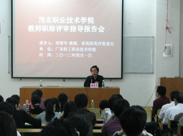 2012年4月1日下午,省高职高评委委员、广东轻工职业技术学院胡智华教授应邀到我院举行教师职称评审指导报告会。报告会由李多民院长主持。