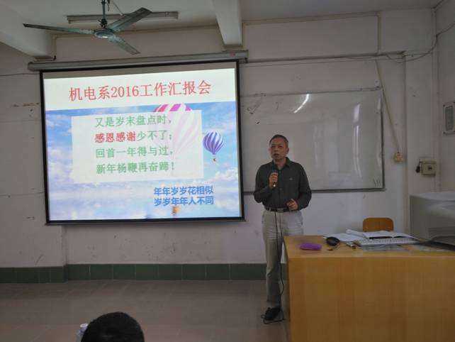 1月6日下午,机电信息系在学院文明北校区举行2016工作汇报会。电气、汽修、机械、模具、数控5个教研室主任和实训中心负责人逐一登台作了总结汇报,畅谈2017发展大计。学院党委书记高鹏出席了汇报会,并发表热情洋溢的讲话,提出了“感恩、好心、法治,身体、能力、诚信”的12字真言与教职工共勉。