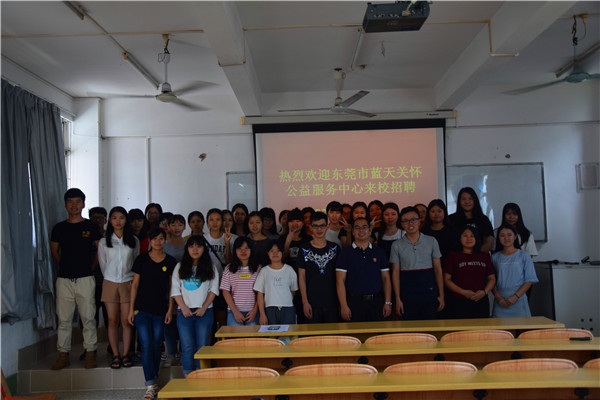 6月9日上午,东莞市蓝天关怀公益服务中心总干事黄远清一行到我校开展宣讲会,并招聘多名思政部社会工作专业学生。