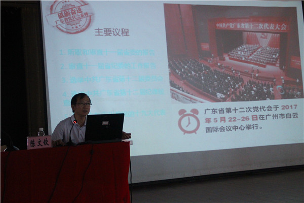 下午,学院在文明北校区礼堂举办学习贯彻省十二次党代会精神宣讲报告会。茂名市委宣讲团成员、市社科联党组成员、专职副主席陈文钦作《深入贯彻习近平总书记重要批示精神,广东在新的起点上再创新局》的专题辅导报告。学院领导、教职工、学生近500人听取了报告。