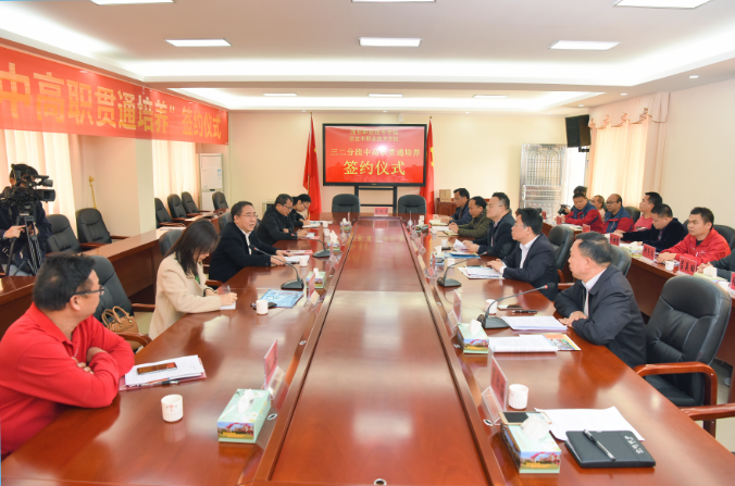 为顺应广东职业教育改革与发展需要,12月26日上午,茂名职业技术学院与信宜市职业技术学校举行三二分段中高职贯通培养试点合作签约仪式,确定以计算机应用技术、汽车检测与维修技术、数控技术三个专业为试点,从2018年开始正式开设中职学段三年、高职学段两年的五年制中高职贯通班。信宜市市委常委、常务副市长李龙飞,教育局局长黎永杰,信宜职校校长黄益辉及班子成员、三大专业负责人,学院院长张庆和教务处、机电系、计算机系相关老师出席了签约仪式,共同为高职招生新形势下的校校合作拉开了序幕。