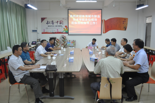 2018年5月15日,珠海城市职业技术学院校长刘华强、副校长吴凡、副校长王宇东等一行5人来我院南校区交流访问。学院党委书记高鹏、副院长梁德萍参与交流活动,学院两办、人事处负责人全程陪同。