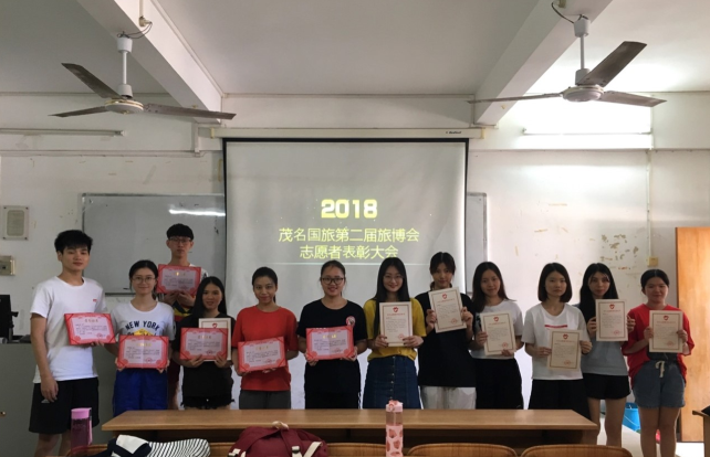 5月30日,中国旅游日广东主会场即茂名市第二届旅游博览会组委会派代表来到学院北校区,为我校学子颁发“青年志愿服务纪念证书”和“优秀青年志愿者证书”。颁奖会在北校区2栋教学楼205举行,经济管理系商务英语专业全体教师和2016级全体学生参加了本次颁奖仪式。组委会主办方代表向经管系2016级商务英语专业114名志愿者颁发了“5.19中国旅游日广东主会场之茂名第二届旅游博览会青年志愿服务纪念证书”,向方炀、杨安宏、卓伟伦等15名同学颁发了“青年志愿者优秀个人奖”证书及礼品。