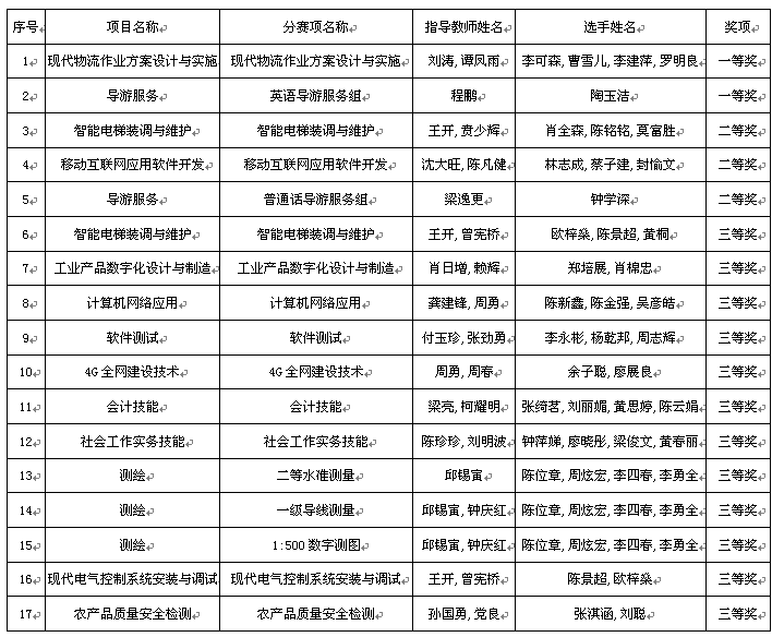 近日,广东省教育厅发布了《广东省教育厅关于公布2017-2018年度全省职业院校技能大赛获奖名单的通知》(粤教职函〔2018〕84号 ),我校参赛团队再创佳绩,共荣获17个奖项,其中一等奖2项,二等奖3项,三等奖12项。
