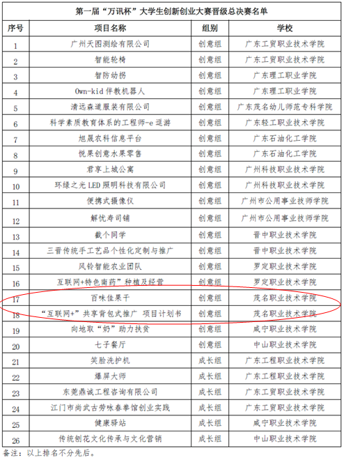 近日,从第一届“万讯杯”创新创业大赛组委会传来喜讯,我校经济管理系学生创业团队的“互联网+共享背包”和化学工程系学生创业团队的“百味佳果干”两项创新创业项目突破重围,在一千多个参赛项目中脱颖而出,成功晋级总决赛。2018年5月-7月历经组委会的网评和网络票选环节,初赛和半决赛,总决赛及颁奖仪式将于7月8日在广东工贸职业技术学院进行。希望我院两个精心准备的创新创业项目能在总决赛中取得理想的成绩,为我院创新创业教育再添荣誉。