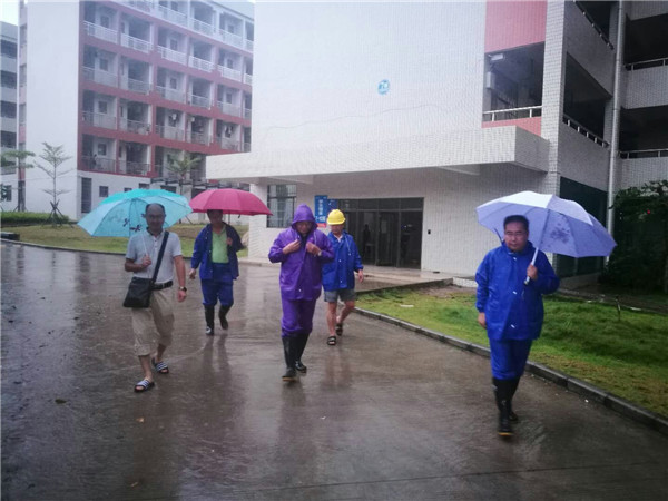 以上率下,靠前指挥。学校领导每天带队到南北两个校区检查指导防台风工作。9月16日至17日,超强台风“山竹”登陆之际,高鹏书记、张庆院长分别带领班子成员,自带干粮24小时驻守北校区和南校区,指挥布置防台风工作。党委办、学院办、总务处、学生处等部门负责人及相关人员,各系领导成员及实训室主任、办公室主任、辅导员全部通宵达旦驻守一线。台风过境后,9月17日上午上班前,高鹏、张庆第一时间带队巡查校园,检查物资损失、防御台风、雨水排放、各建筑物损毁等情况。