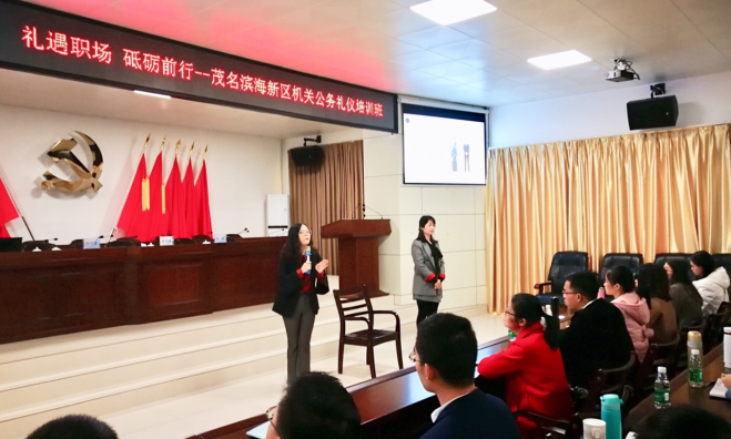 12月14日,我校经管系教师陈科、陈伟霞应邀为茂名市滨海新区新入职的区、镇公务员,教育、卫生系统的160位机关事业单位人员开展题为“礼遇职场,砥砺前行”的公务礼仪培训。现场培训从习近平总书记提出的文化自信出发,阐述礼仪作为中华传统文化的核心内容对社会主义核心价值观的影响、以机关人员的视角对公务形象礼仪、公务接待礼仪、机关办公礼仪等方面进行了生动形象、深入浅出的讲解,赢得了阵阵掌声,从理论和实操角度对日常机关工作中礼仪方面可能忽视的细节进行了讲解和现场示范。