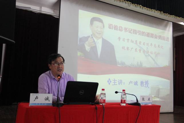 广东石油化工学院教授,教学名师,全国优秀教师、全国高校优秀思想政治理论课教师,马克思主义学院党委书记卢诚教授应邀来校宣讲。卢教授从习近平总书记视察广东讲话释放了“中国改革开放永不停步”等五大重要信号;四大重大意义;四个要求;从“提高政治站位,学深悟透”、“