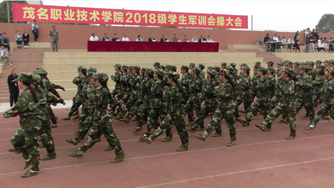 伴随着雄壮激昂的《中国人民解放军进行曲》,各方队进行分列式表演,受训学生以昂扬的斗志,饱满的精神依次从主席台前走过,接受学院领导和军分区领导的检阅,受阅方队动作规范、技术娴熟、军容严整。从整齐的步伐里,显现了当代军人的飒爽英姿;从嘹亮的口号声中,听到了青年学生的爱国心声;从坚毅的脸庞上,读出了茂职学子奋勇向前的坚定信念。军体拳、匕首操方阵带来了气势磅礴的军体操表演。同学们身手干练、气势如虹,在教官的指令下,向现场师生展示了拳拳爱国之心和报国之志,赢得了阵阵掌声。花样表演方队展示了我校秉持“修德、强技、求实、创新”的校训,展示出了我校注重培养学生的道德修养、职业能力、创新精神和创业能力。