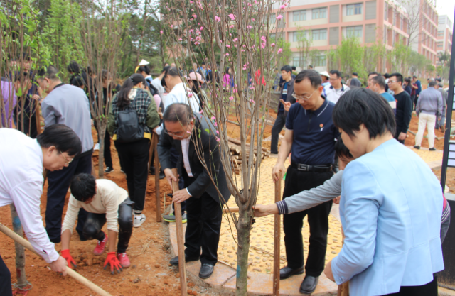会后,全体教职工到智慧泉旁举行了植树活动。