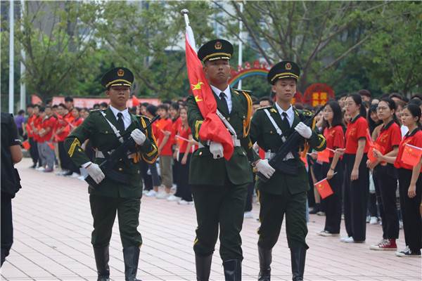 国旗护卫队队员们踏着朝阳的晨辉,英姿飒爽,迈着整齐有力的步伐,护送国旗进场。伴随着气势磅礴、雄壮嘹亮的国歌,全校师生深情注视着鲜艳的五星红旗冉冉升起,升起了茂职院人的信仰,也升华了青年学子对祖国无限的热爱和崇高的敬意。