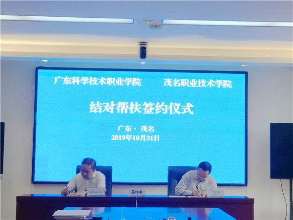 2019年10月31日,为落实省教育厅关于实施一流高职院校结对帮扶计划,深入实施“扩容、提质、强服务”工程,进一步提升我校人才培养质量和办学水平,增强服务区域经济社会发展能力。广东科学技术职业学院----茂名职业技术学院结对帮扶签约仪式在茂名职业技术学院北校区举行。广东科学技术职业学院校长李龙图,党委委员、党委组织部部长刘晓华,茂名职业技术学院张庆院长等学校领导出席了签约仪式。