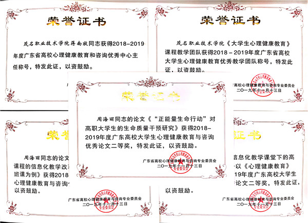 我校心理健康教育与咨询中心主任蒋南牧在年会上荣获“广东省高校心理健康教育和咨询优秀中心主任”;我校《心理健康教育》课程教学团队被评为“广东省高校大学生心理健康教育优秀教学团队”;周海丽老师撰写的论文《“正能量生命行动”对高职大学生的生命质量干预研究》、《信息化教学课堂下的高职学生学习行为分析--以《心理健康教育》课程为例》和《高职院校心理健康教育课程的信息化教学改革实践研究--以蓝墨云班课为例》均获得“优秀论文二等奖”。