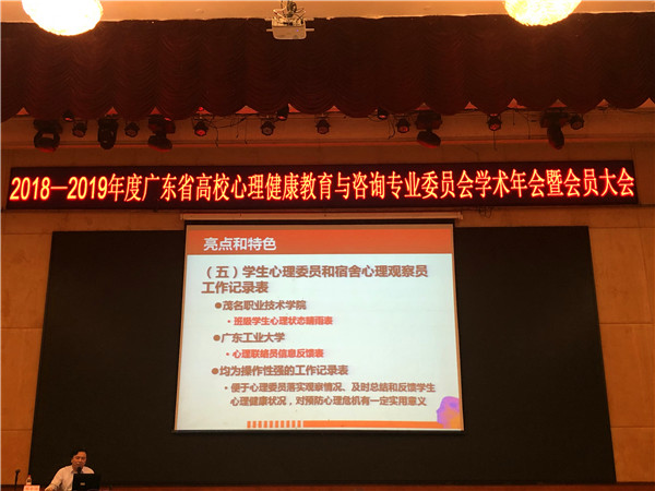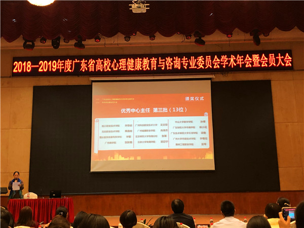 11月13日至14日,2018-2019年度广东省高校心理健康教育与咨询专业委员会学术年会在鹤山举行。会上发布了2018年下半年及2019年上半年广东高校大学生心理健康教育与咨询工作调研报告,表彰了广东省高校优秀心理中心主任、优秀教学团队、优秀论文及出版物。来自广东省各高校的心理健康教育与咨询工作者进行了学术研讨和工作经验交流。