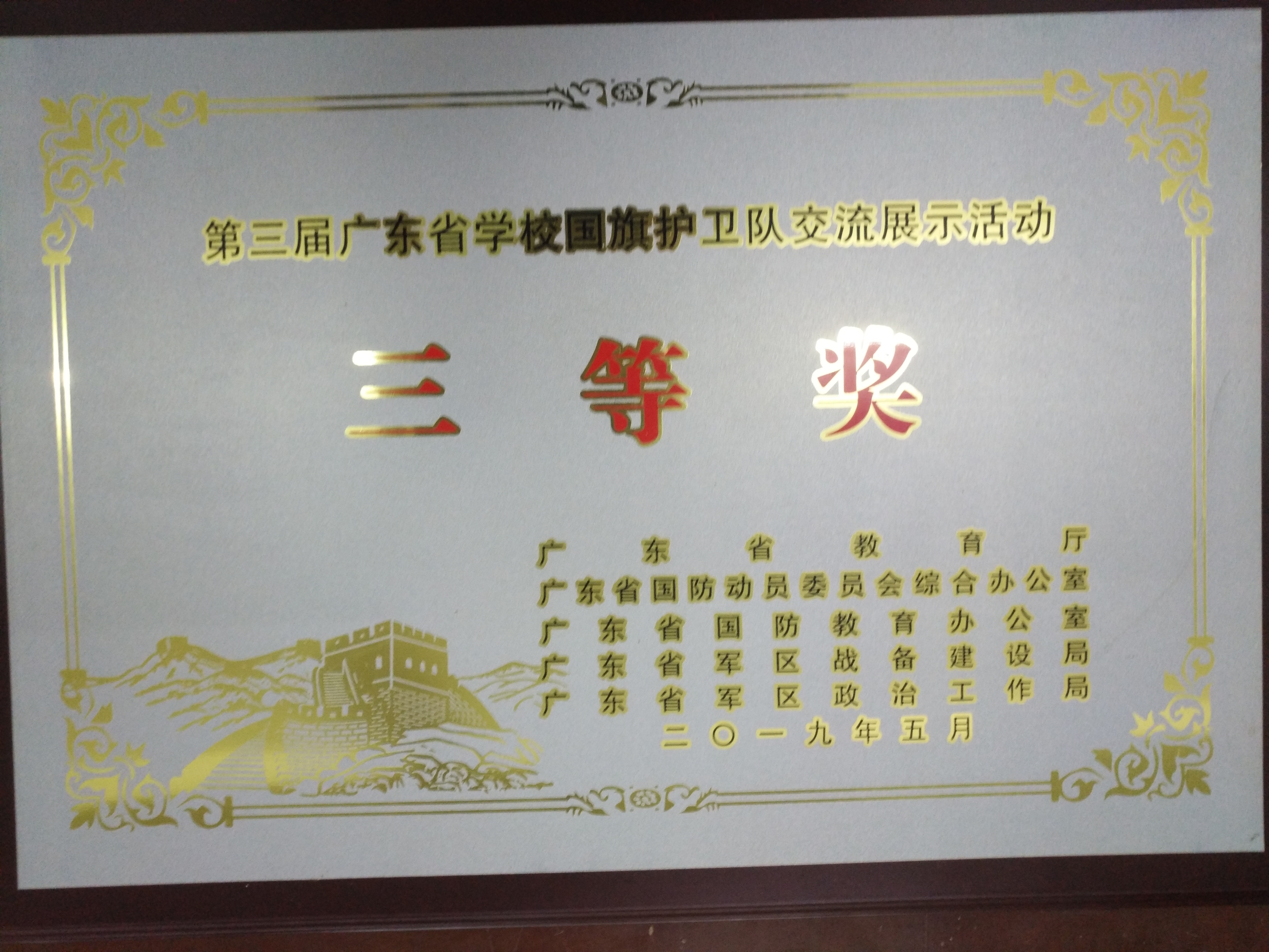为更好地迎接“广东省学校国防教育成果展”比赛,学院团委干部周?媚每天对国旗护卫队队员们进行了指导和训练,国旗护卫队优异表现,充分展现了我院学子积极向上的精神风貌,展示了学院青年勇于担当和追求卓越的精神风貌,为学院校园文化树立了一面鲜艳的旗帜。凭借出色的发挥,我院国旗护卫队荣获第三届广东省学校国旗护卫队交流展示活动三等奖。