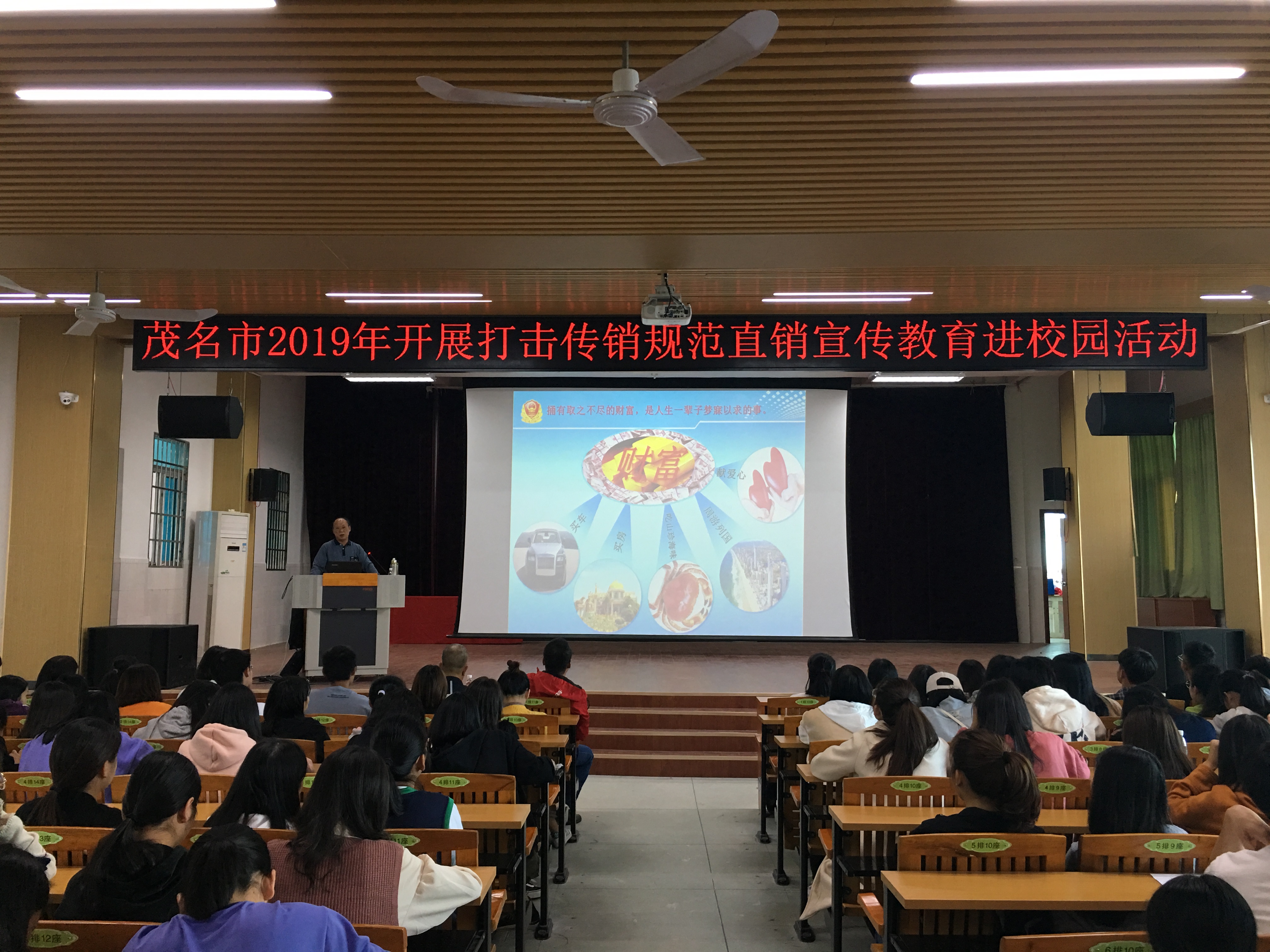 为了进一步加大防范和打击传销工作力度,提高我校学生“防传销”意识,增强学生自我保护与防范能力,12月12日下午,学生处联合茂名市市场监督管理局、茂南区市场监督管理局在我校北校区开展“打击传销规范直销进校园”宣教活动。活动包括两部分:北校区礼堂开展宣传讲座、北校区广场开展宣传教育活动。