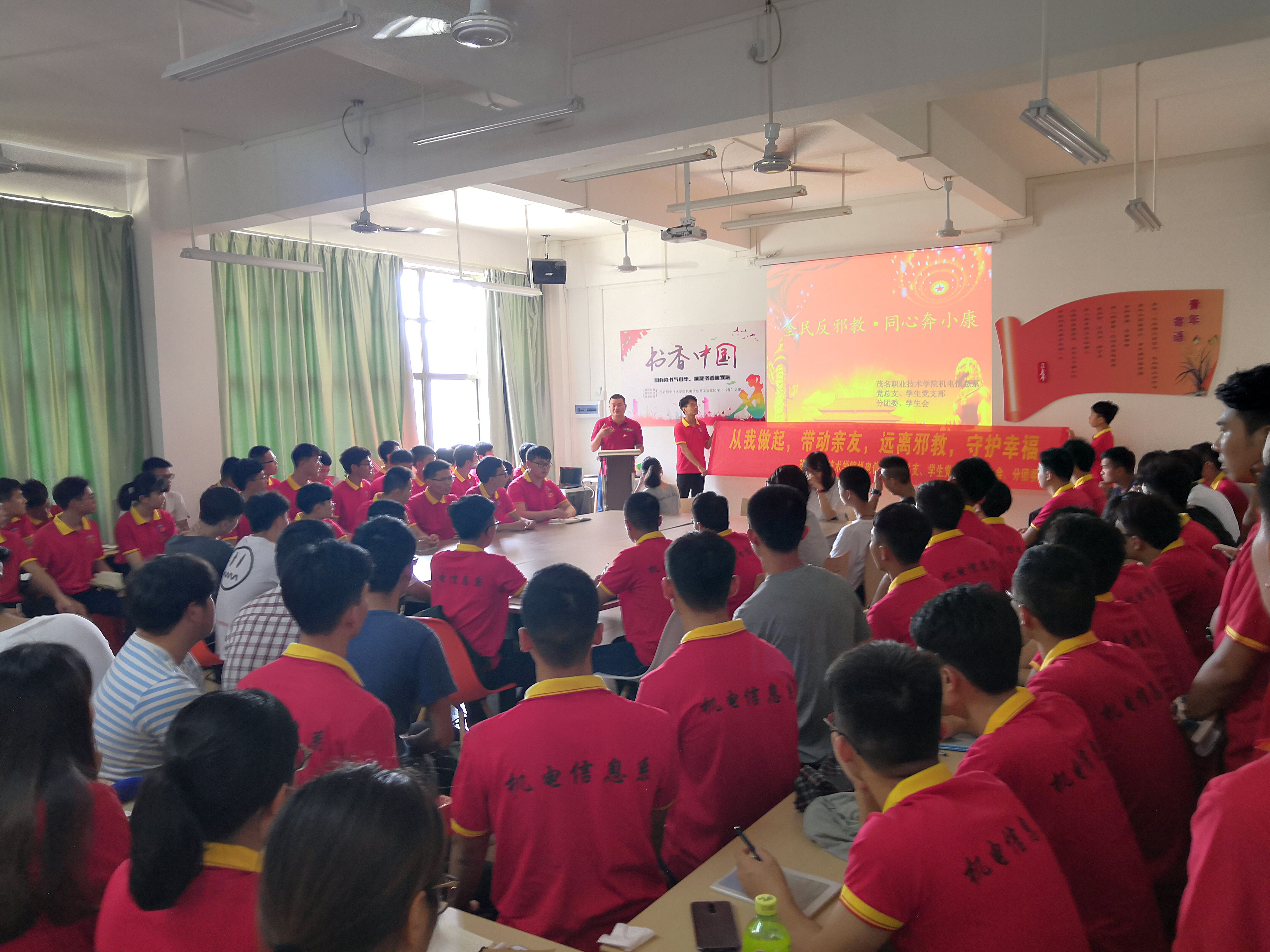 为了贯彻落实中共中央办公厅、国务院办公厅印发的《关于加强和改进新形势下反邪教工作的意见》(中办发[2017]49号)精神和全省“全民反邪教·同心奔小康”活动等工作要求,落实“从我做起,带动亲友,远离邪教,守护幸福”的系列活动主题,将和谐校园建设进行到底。9月6日中午,机电系学生党支部、学生会、分团委在南校区党员活动中心进行反邪教签字活动。机电系辅导员张汉军、何铮、何靖文和16、17级各班班长、团支书、入党积极分子参加了会议。