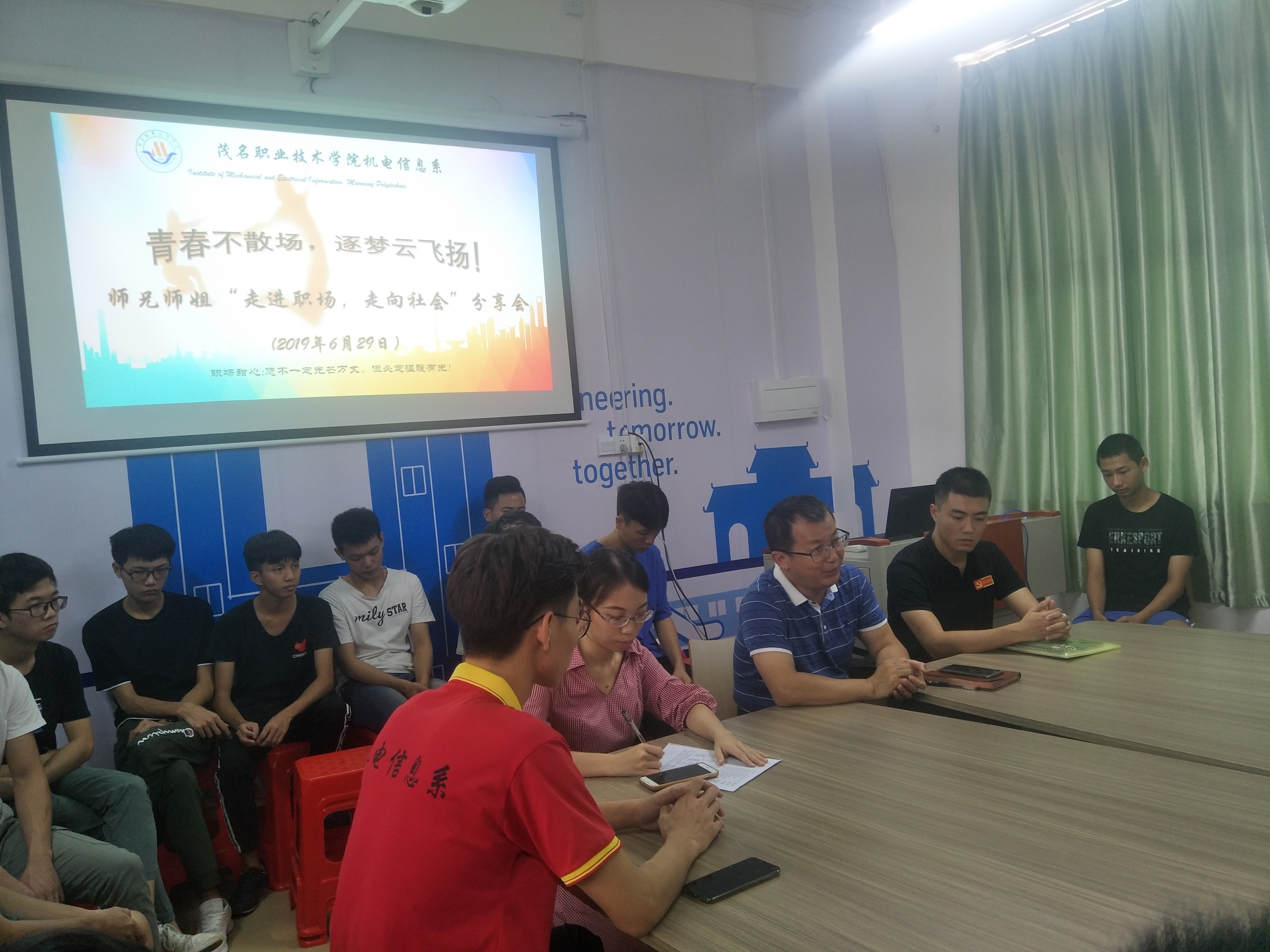 6月29日中午,借我校举行2019届毕业典礼之际,机电系邀请多位优秀毕业生举办“走进职场,走向社会”分享会,畅谈他们由学生变为社会职场人的心得体会与情感变化历程。系领导彭树福、18级辅导员何靖雯和优秀毕业生代表、18级学生代表参加了本次分享会。