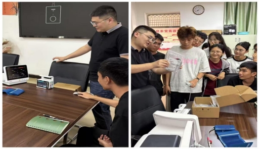 理论教学结束后,迈瑞监护生产部经理张星澗带领技术团队将企业自主研发的医疗设备带入课堂,组织学生分组进行仪器操作与模拟实训。在授课老师的指导下,学生们动手拆解设备、并通过自身体验进一步了解仪器的使用过程及操作原理。通过现场演示设备参数校准与亲身体验,学员们进一步掌握了精密仪器的操作规范,并对医疗行业的高标准、严要求有了更深刻的理解。