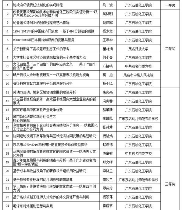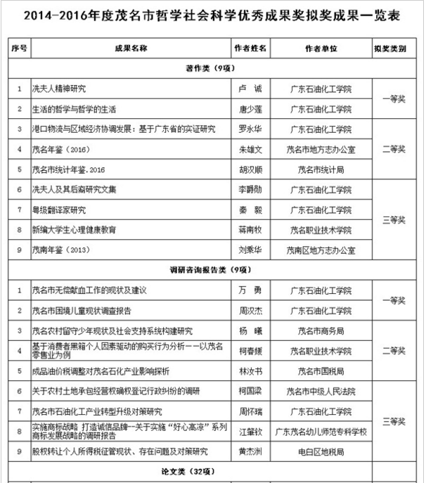 茂名市2014-2016年度哲学社会科学优秀成果奖拟奖项目公示
