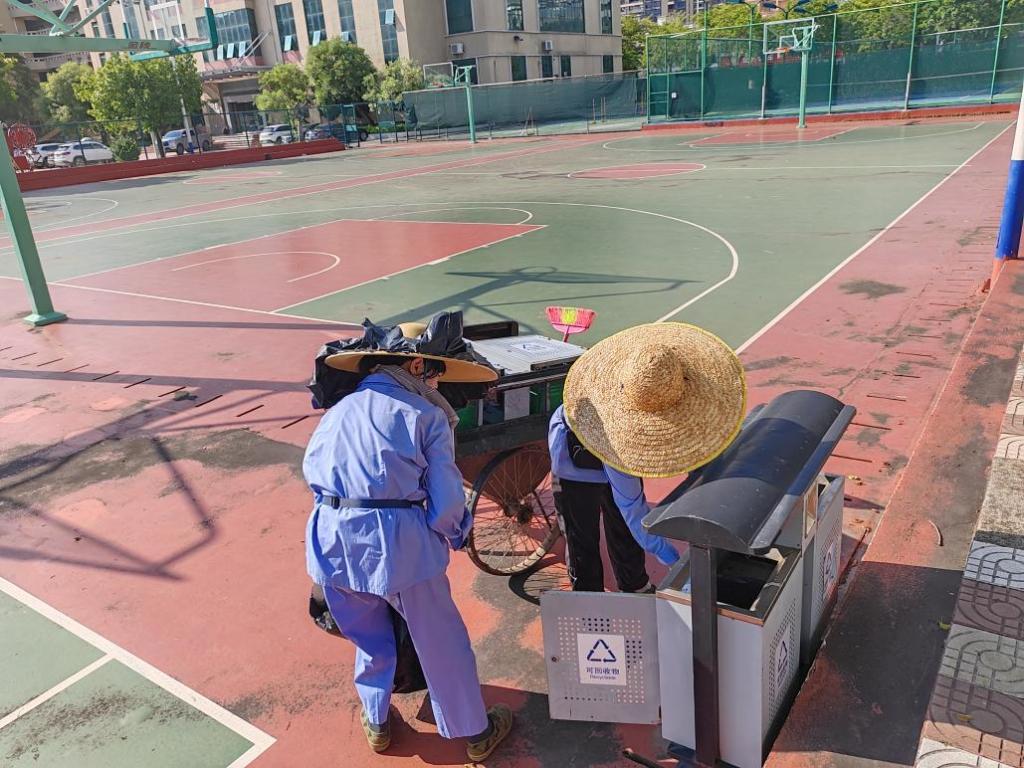 图为清洁阿姨将清空后的垃圾桶转运至室内,以防台风吹走