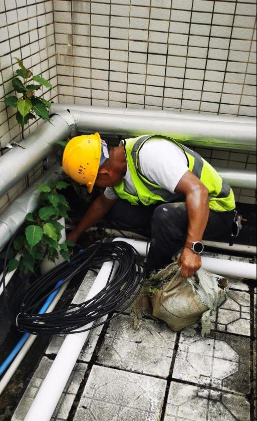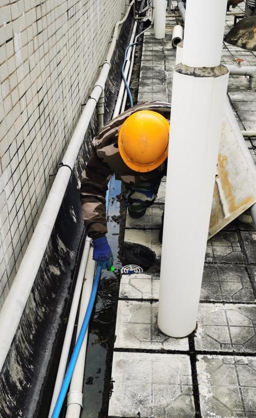 图为检查天台排水口、清理排水口周围杂物,防止雨水堵塞