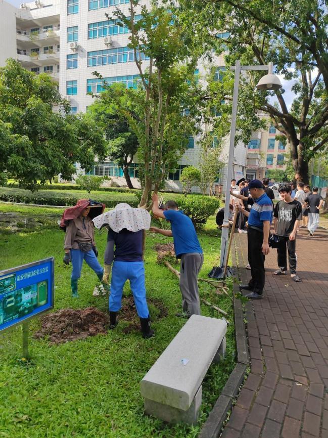 图为南校区后勤人员修剪、扶植被台风吹倒的树木,保障校道通畅