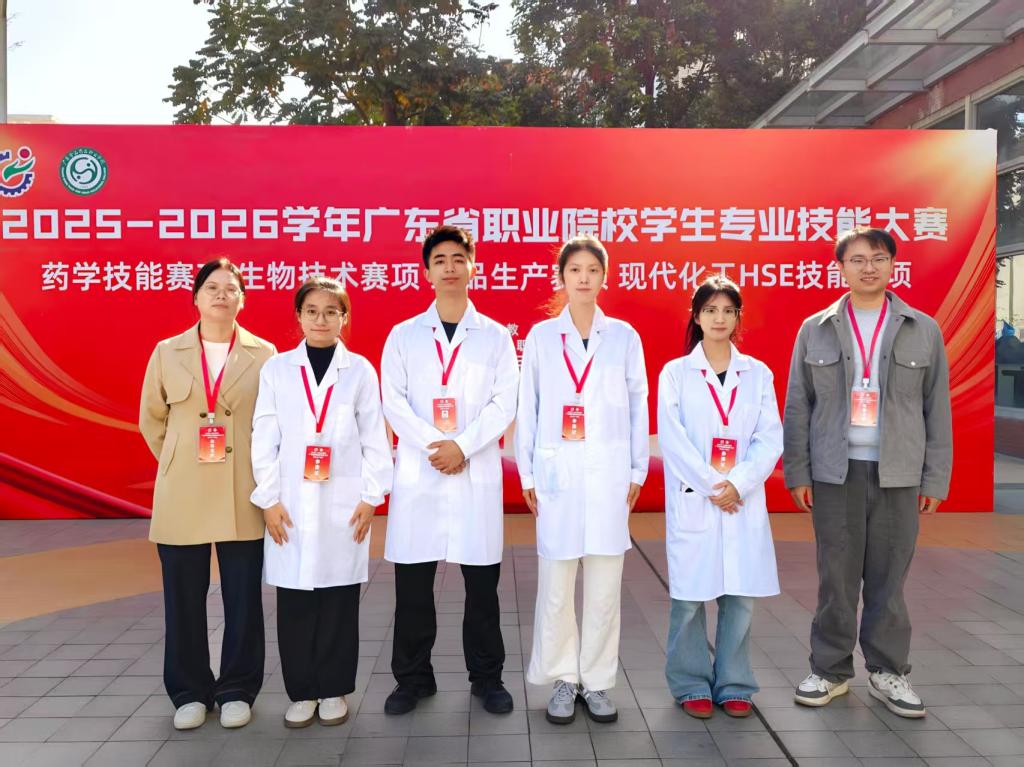 近日,2025-2026学年广东省职业院校学生专业技能大赛“药品生产”赛项在广东食品药品职业学院圆满落幕,全省27支高职院校代表队同场竞技。由化学工程系教师赖谷仙、何镇熹指导,学生贺宝龙、梁爱妍、苏依琪、郑佳茹组成的代表队,在学校尚未拥有制药工程课程体系,且无药学专业背景师生的情况下,经过认真备赛,从众多药品生产强校中脱颖而出,取得第五名的好成绩,荣获该赛项二等奖,实现了我校在生物医药赛道的良好开局。