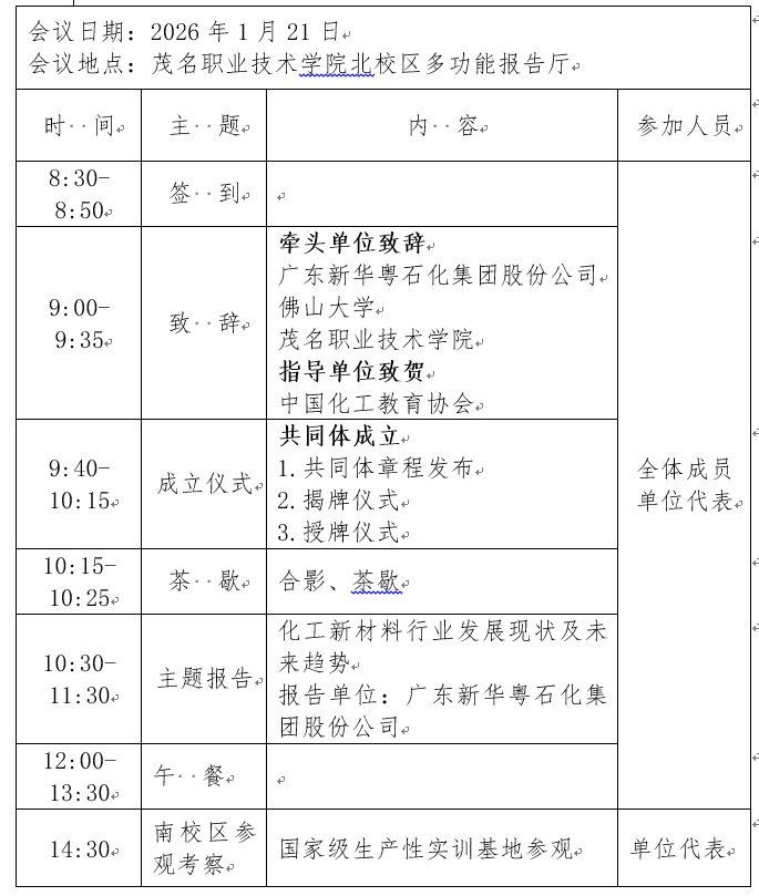 为深入学习贯彻党的二十大精神,贯彻落实教育部发布的《行业产教融合共同体建设指南》,深化现代职业教育体系建设,助力绿色石化与新型生化材料行业产业高质量发展,由广东新华粤石化集团股份公司、佛山大学、茂名职业技术学院牵头,联合相关高等院校、行业协会和企业共同参与成立“绿色石化与新型生化材料行业产教融合共同体”。经研究,定于2026年1月20日 - 21日,在广东茂名召开成立大会,现将会议有关通知如下: