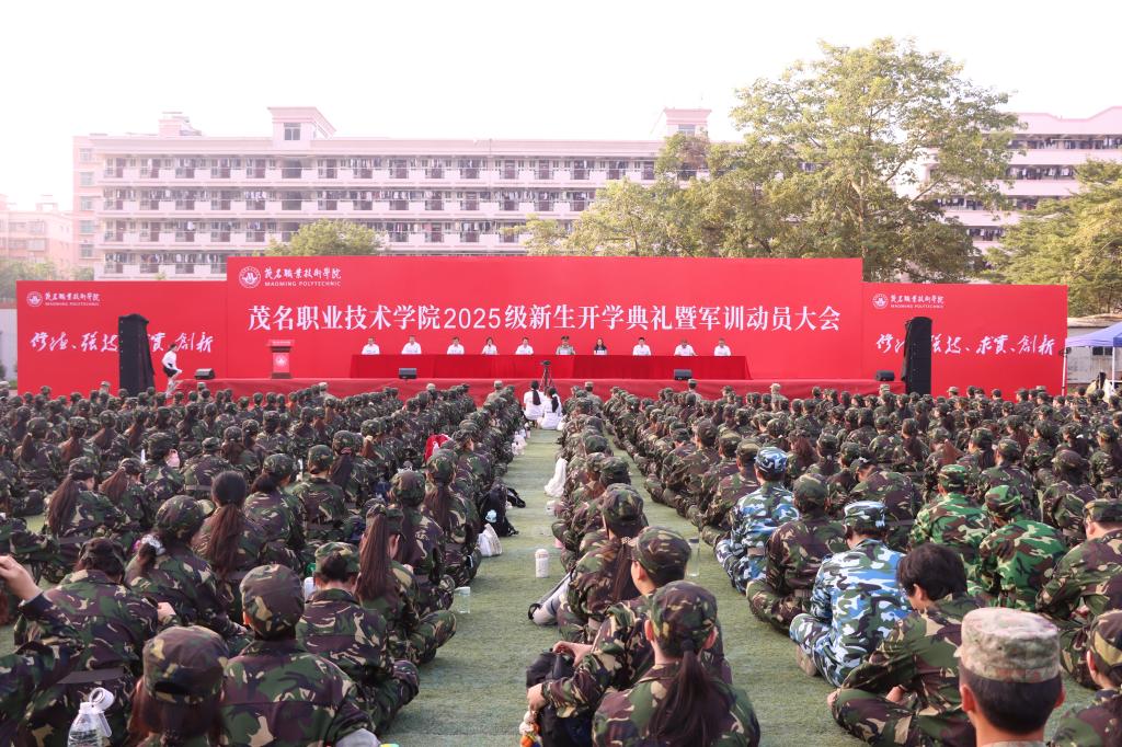 大风起兮云高飞,秋色胜春朝。校园里洋溢着青春的活力与蓬勃的朝气,10月11日上午,我校在南北两校区同时举行2025级新生开学典礼暨军训动员大会。茂南区和电白区人武部领导,学校领导,相关职能部门负责人,各系负责人、教师代表、军训教官以及全体2025级新生共同参加了此次盛会。