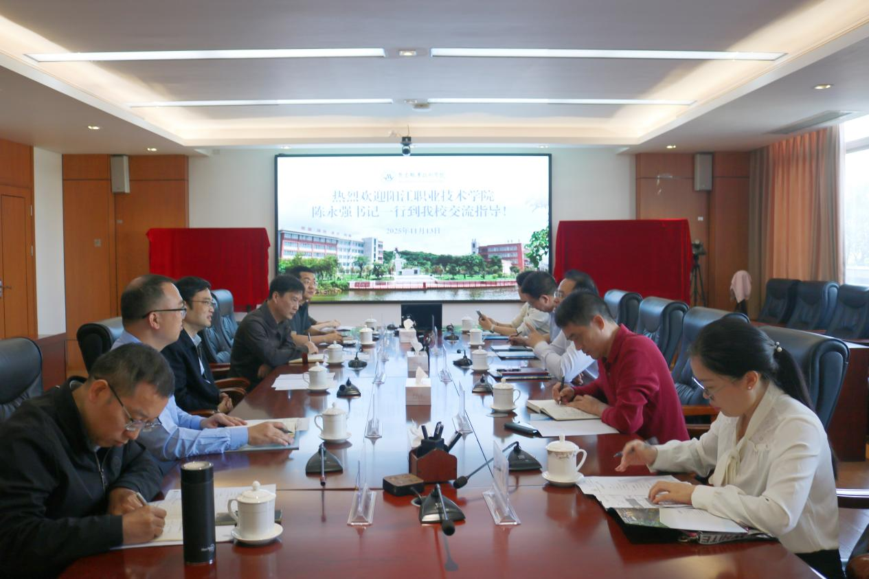 11月13日上午,阳江职业技术学院党委书记陈永强一行5人到我校调研交流。学校党委书记扶国热情接待了来访客人并召开座谈会进行交流,副院长董利,党政办、教务部、经济管理系相关人员参加座谈。
