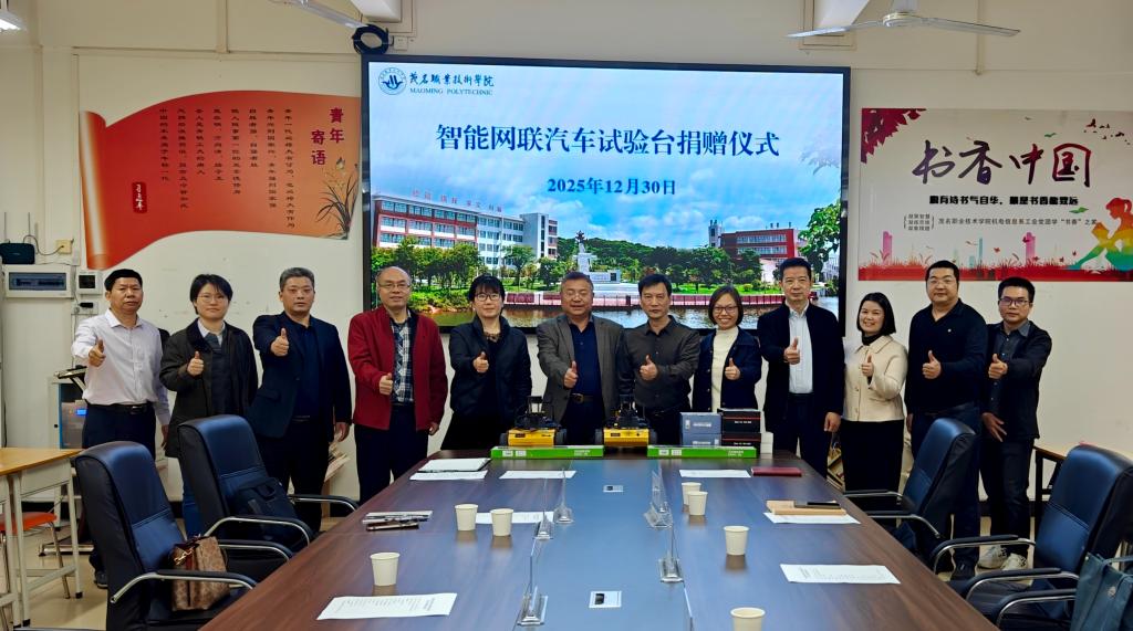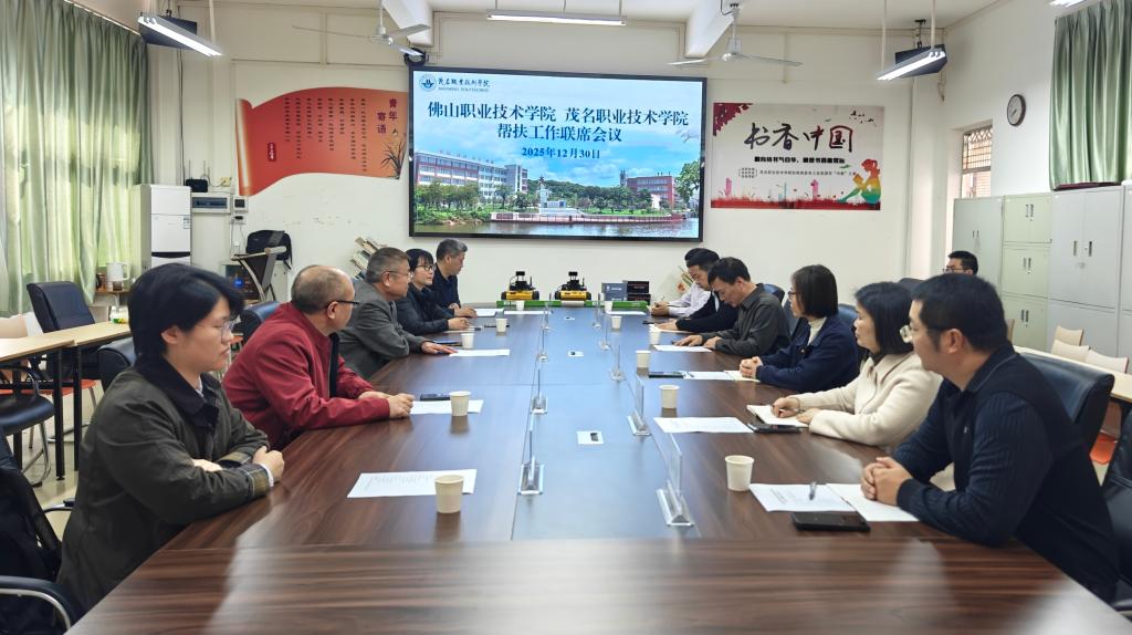12月30日上午,佛山职业技术学院与茂名职业技术学院帮扶工作联席会在茂名职业技术学院南校区机电实训楼204室召开。会议聚焦帮扶成果总结与后续协作规划,并举行“智能网联汽车试验台”捐赠仪式。茂名职业技术学院副校长董利主持会议,佛山职业技术学院副校长赵银生、茂名职业技术学院副校长张蓝青等两校相关领导和部门负责人出席会议。