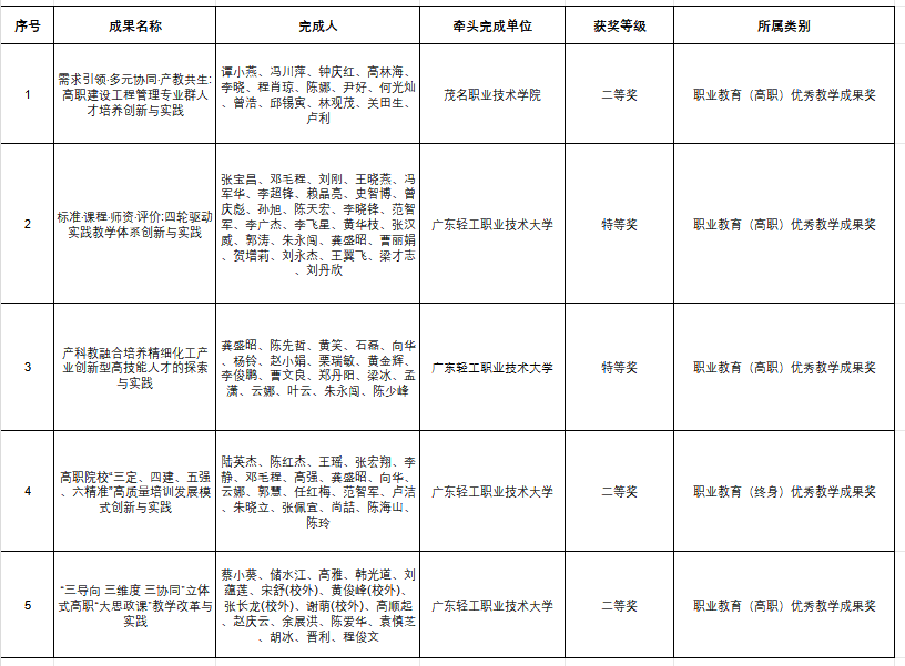 近日,广东省人力资源和社会保障厅、广东省教育厅联合印发《关于表彰全省学校优秀教学成果奖(基础教育与职业教育类)的决定》(粤人社发〔2026〕4号),我校在教学成果评选中获得佳绩:由学校牵头完成的1项成果荣获职业教育(高职)类二等奖,同时作为参与单位完成的4项成果中,获特等奖2项、二等奖2项。