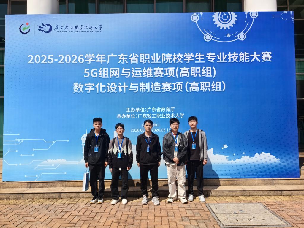 近日,由广东省教育厅主办的2025-2026年广东省职业院校技能大赛(高职组)"5G组网与运维"赛项在广东轻工职业技术大学(南海校区)举行。计算机工程系选派林润民、徐锴枫、张国靖、梅杰4名学生组成的参赛队,在周勇、吕晓梅两位老师的精心指导下,与来自全省44所高职院校的精英同场竞技,凭借扎实的专业技能和卓越的团队协作能力,以总分第二名的优异成绩勇夺省赛一等奖。