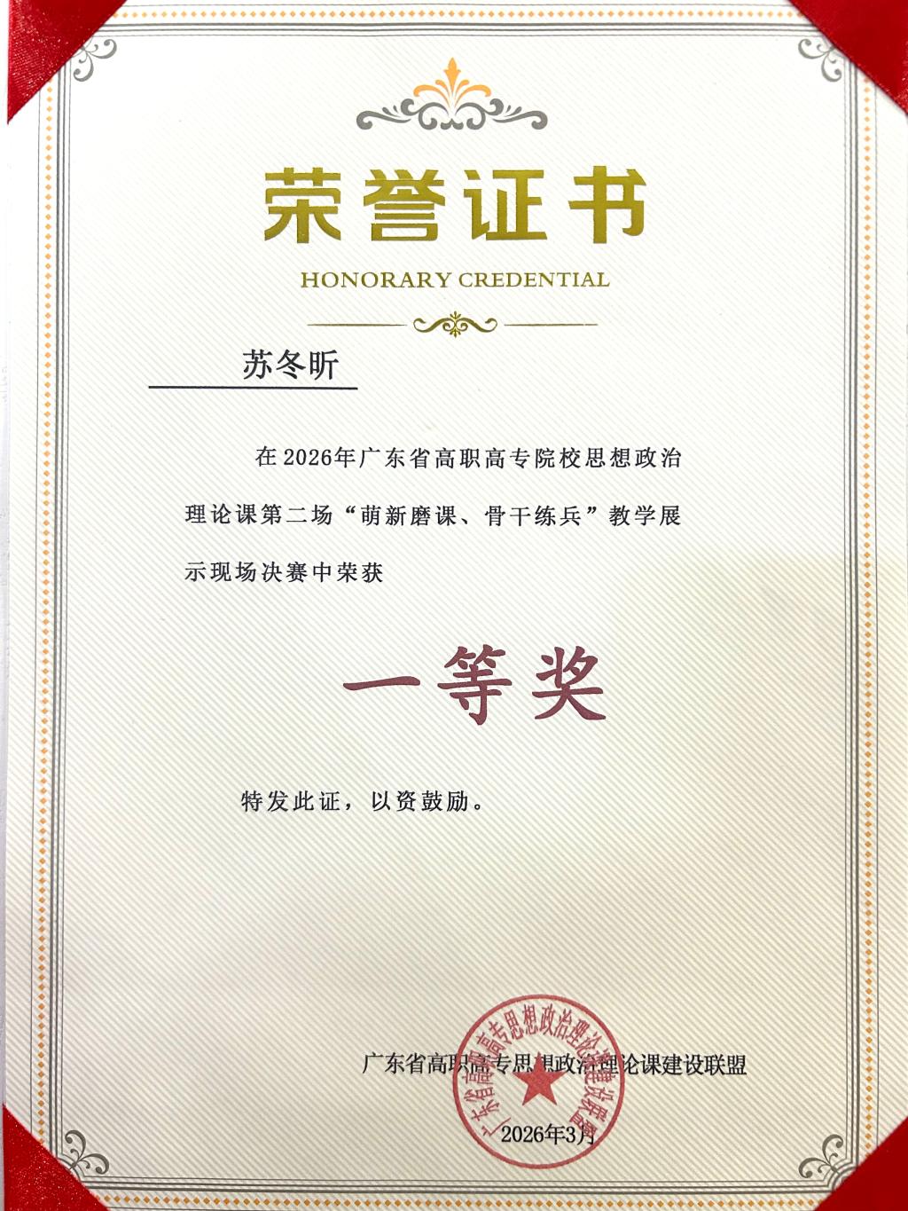 3月18日,广东省高职院校思政课2026年度第二场“萌新磨课、骨干练兵”(“毛泽东思想和中国特色社会主义理论体系概论”课)现场决赛圆满结束。茂名职业技术学院马克思主义学院苏冬昕老师凭借精湛的教学技艺、扎实的理论素养和生动的课堂展示,在全省众多优秀选手中脱颖而出,荣获一等奖,彰显了我校思政教师的专业实力与育人风采。