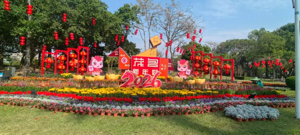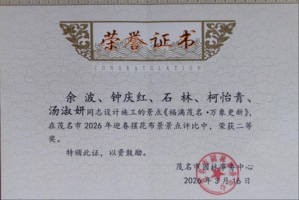 近日,茂名市2026年迎春摆花布景景点评比结果正式揭晓。由我校土木工程系余波、钟庆红、石林、柯怡青、汤淑研等多位师生共同创作,并落地于新湖公园南门的主题花景作品《福满茂名·万象更新》,凭借其精妙的设计、深厚的文化内涵与出色的现场呈现,在众多参评作品中脱颖而出,荣获二等奖。这是土木工程系深化“政-校-行”协同育人、服务地方社会经济发展的实践成果。