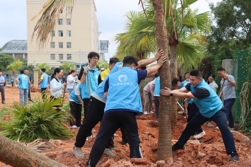 活动现场热火朝天、干劲十足。300名师生分为10组,每组成员分工合作,不甘落后,挥锹铲土、定点挖坑、扶苗固根、回填培土、浇水浇灌……一道道工序有条不紊、相互配合。校领导带头示范,与师生们并肩劳作,播撒绿色希望,培育美好未来。“葵树有助于净化室内空气,减少有害气体的含量,提高空气湿度”“等葵树长起来,这片又是绿树成荫了”。扶锹间隙,校领导与师生们亲切交流,憧憬绿树成荫的美好景象。