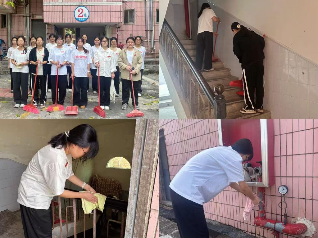 活动当天,入党积极分子们热情高涨,早早集合完毕。他们手持抹布、扫把等工具,分组对教工楼的楼梯通道、扶手栏杆等公共区域进行了全面细致的清洗。大家分工协作,干劲十足:有的认真清扫台阶上的灰尘与杂物,有的用水管冲洗,有的仔细擦拭楼梯扶手,不放过任何一个卫生死角。经过近两个小时的共同努力,教工楼环境焕然一新。