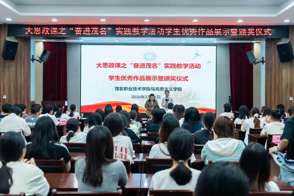 3月26日下午,茂名职业技术学院北校区思政实践室内气氛热烈,“奋进茂名·青春映像”主题实践活动颁奖典礼在此隆重举行。学校领导、马克思主义学院全体教师及获奖学生代表齐聚一堂,共同见证这一融合思政教育与文化实践的荣誉时刻。