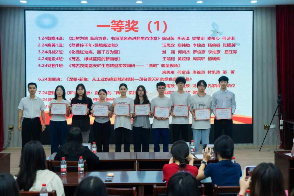 在一等奖作品展播及创作分享环节,三组获奖学生代表走上讲台深情讲述。他们首先向马克思主义学院提供的宝贵实践平台致以诚挚谢意,并表示这份荣誉离不开课程老师的悉心指导。正是在老师们的启发下,团队才得以将晦涩的理论知识转化为鲜活的影像语言。他们表示,通过这次活动,不仅提升了专业技能,更在行走中加深了对茂名这片土地的理解,真切感受到“奋进茂名”的时代强音。