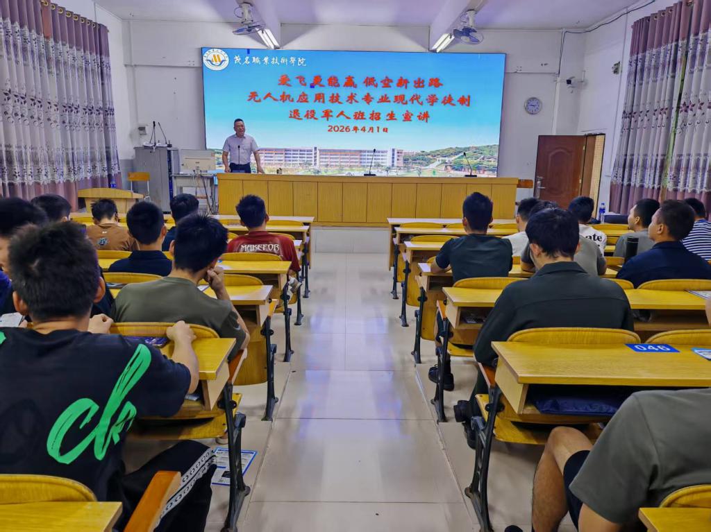 在高州市退役军人适应性培训班上,机电信息系副主任赖辉向学员们详细介绍了我院的办学规模、办学成果及无人机专业发展前景。他结合系部无人机专业的特色与就业导向,系统讲解了本年度退役军人现代学徒制的培养模式、课程设置及招考流程。宣讲结束后,多位学员表现出浓厚兴趣,并针对入学条件、报名方式等具体事宜进行了细致咨询。(文/图:继续教育学院)