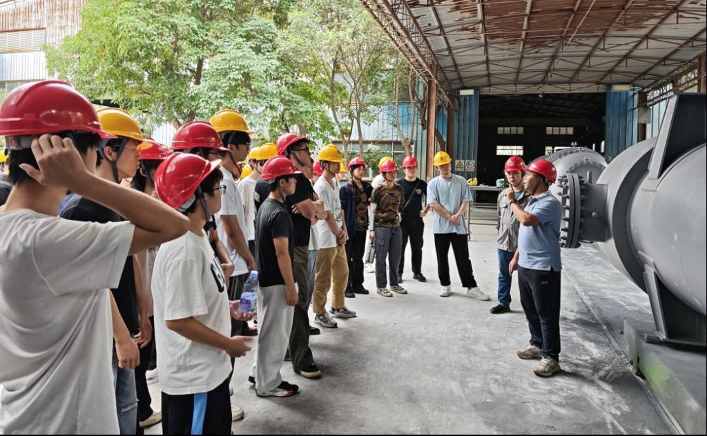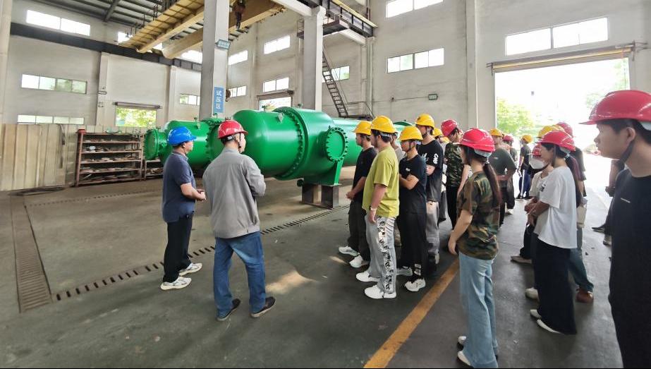 随后,在企业技术骨干与两位老师的共同带领下,同学们分组走进生产车间。车间内,大型电力换热设备、行车吊装系统、精密加工装置有序排布。技术人员结合现场设备,为同学们详细讲解了企业核心产品的设计原理、制造工艺、装配流程以及质量控制要点,从大型管壳式换热器的管板加工、管束装配,到压力容器的焊接、无损检测、试压、防腐处理等关键工序,一一进行了细致拆解,同时结合企业三十余年的生产经验,分享了电力、石化行业对承压设备的严苛标准与行业应用场景。