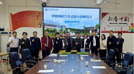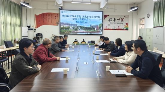 2025年12月30日上午,佛山职业技术学院与茂名职业技术学院帮扶工作联席会在茂名职业技术学院南校区机电实训楼204室召开。会议聚焦帮扶成果总结与后续协作规划,并举行“智能网联汽车试验台”捐赠仪式。茂名职业技术学院副校长董利主持会议,佛山职业技术学院副校长赵银生、茂名职业技术学院副校长张蓝青等两校相关领导和部门负责人出席会议。