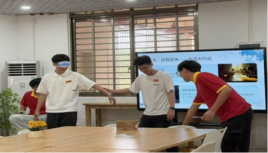 本环节包含“极限收纳接力”与“蒙眼互助大挑战”两项任务。队员在仅靠语言指挥的情况下,引导蒙眼同伴绕过障碍并完成指定操作。同学们在协作中提升了生活自理与互助服务能力,切实践行了自我服务理念。
