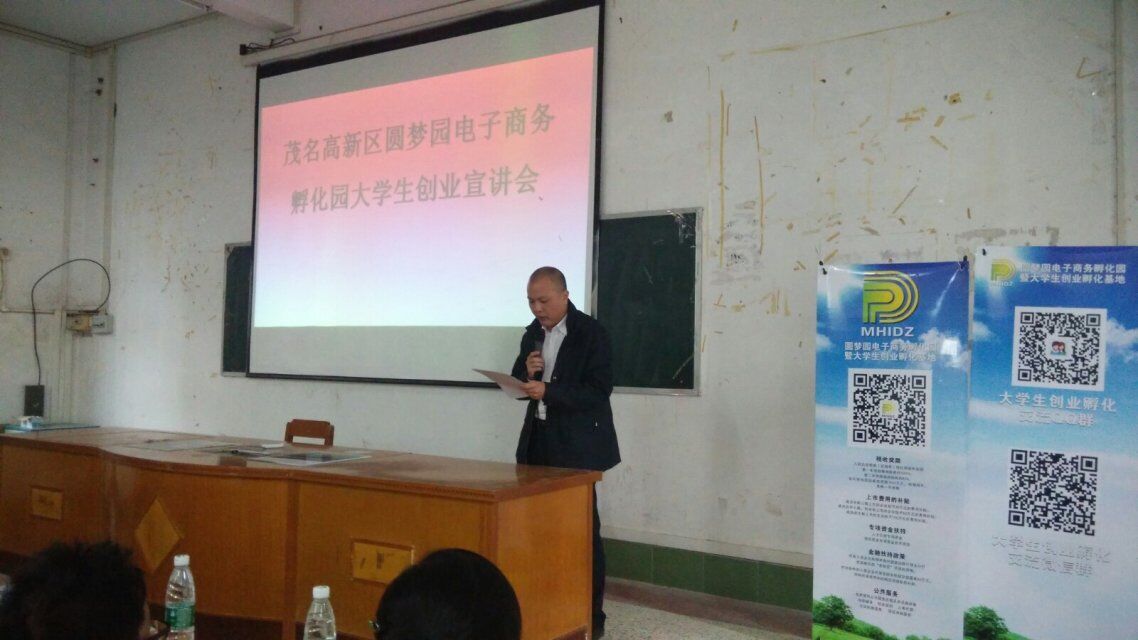 1月14日下午,由茂名高新区电子商务管理中心主办,茂名职业技术学院与茂名百川网络科技有限公司承办的大学生创业宣讲会在茂名职业技术学院的2号教学楼105教室举行。区电商管理中心主任黄育英、茂名职业技术学院经管系副书记黄劲以及茂名百川网络科技有限公司董事长凌彬出席了宣讲会并发表讲话。