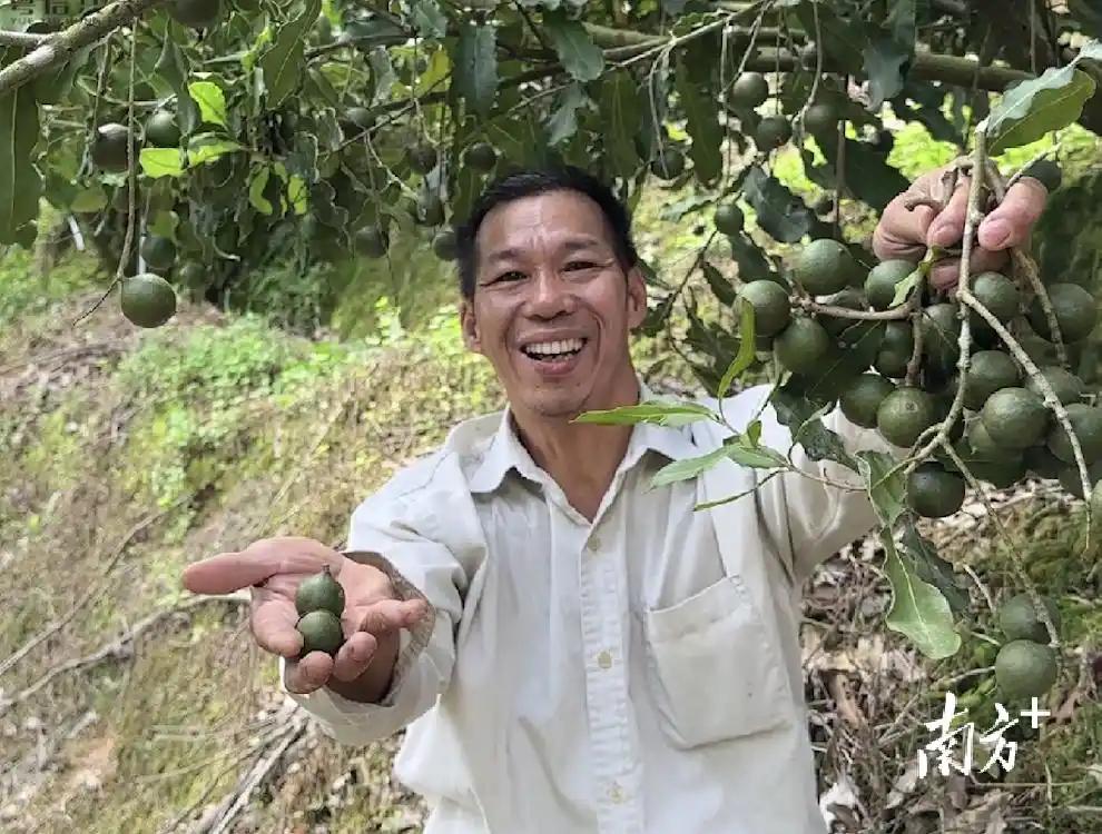 为把家乡的荒山野岭变废为宝,邓其通在2018年成立坚果种植专业合作社,创建400多亩澳州坚果试验示范基地。经过6年的反复试验,最终确认品种适合在信宜种植。目前带动300多户农户种植,面积从400多亩发展到6000多亩,在信宜东镇、白石、丁堡、池洞等镇,把澳洲坚果给种了起来。